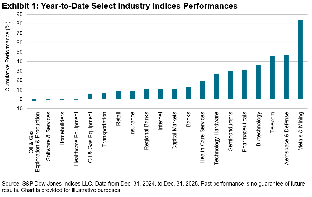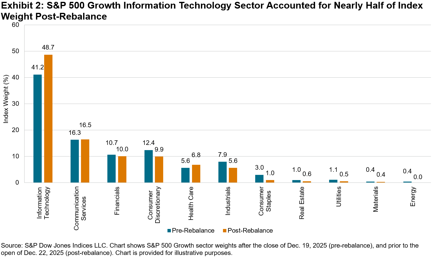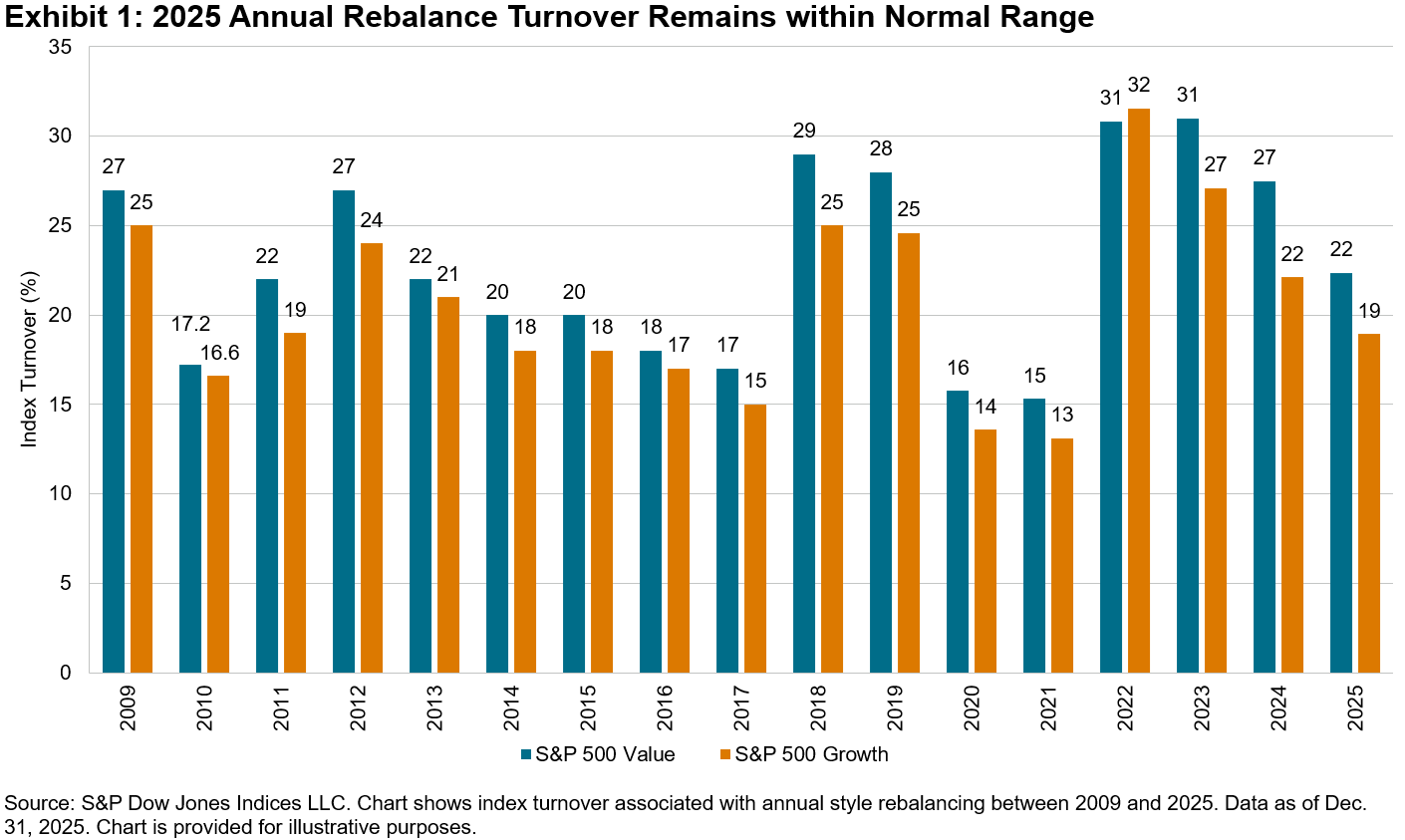The S&P U.S. Style Indices completed their annual rebalance in December 2025. Exhibit 1 shows that the 2025 changes were less pronounced than prior years: turnover for the S&P 500® Growth and S&P 500 Value was lower than the past three annual rebalances. Nonetheless, there were several shifts in index composition.