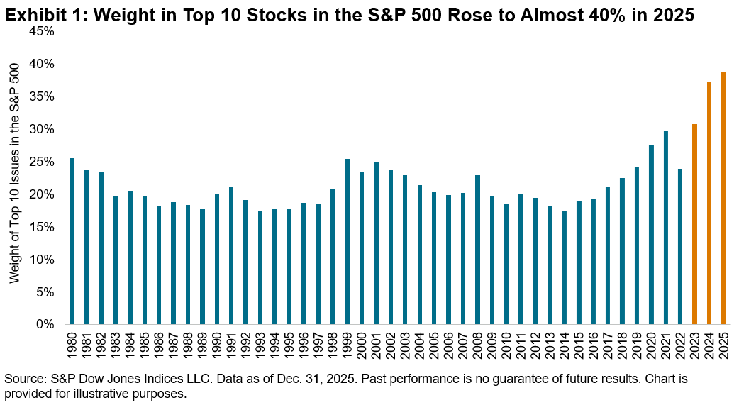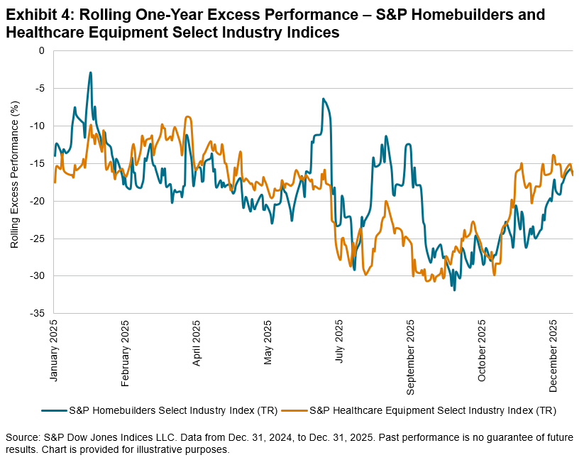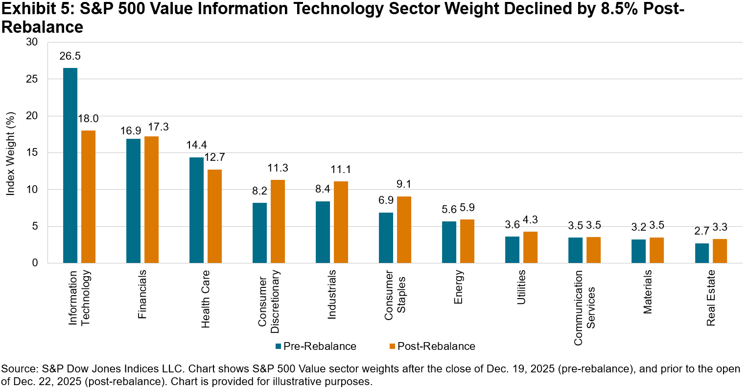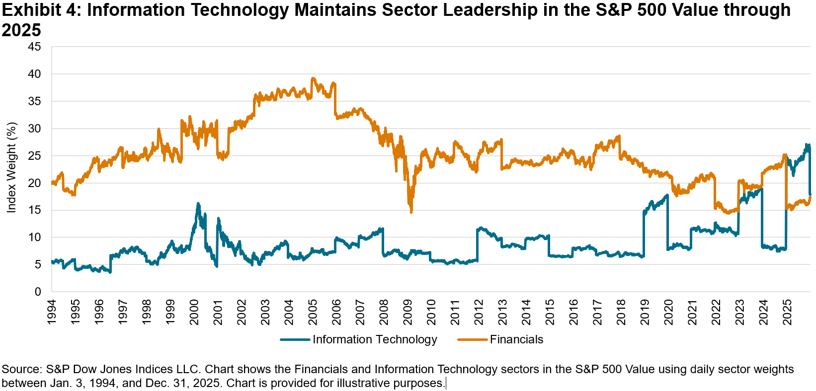 While Financials has traditionally dominated the S&P 500 Value, Information Technology’s growing influence in the U.S. large-cap segment has reshaped the index composition. Since the 2024 rebalance, Information Technology has held the largest sector weight in the S&P 500 Value and maintained that leadership throughout 2025 (see Exhibit 4).