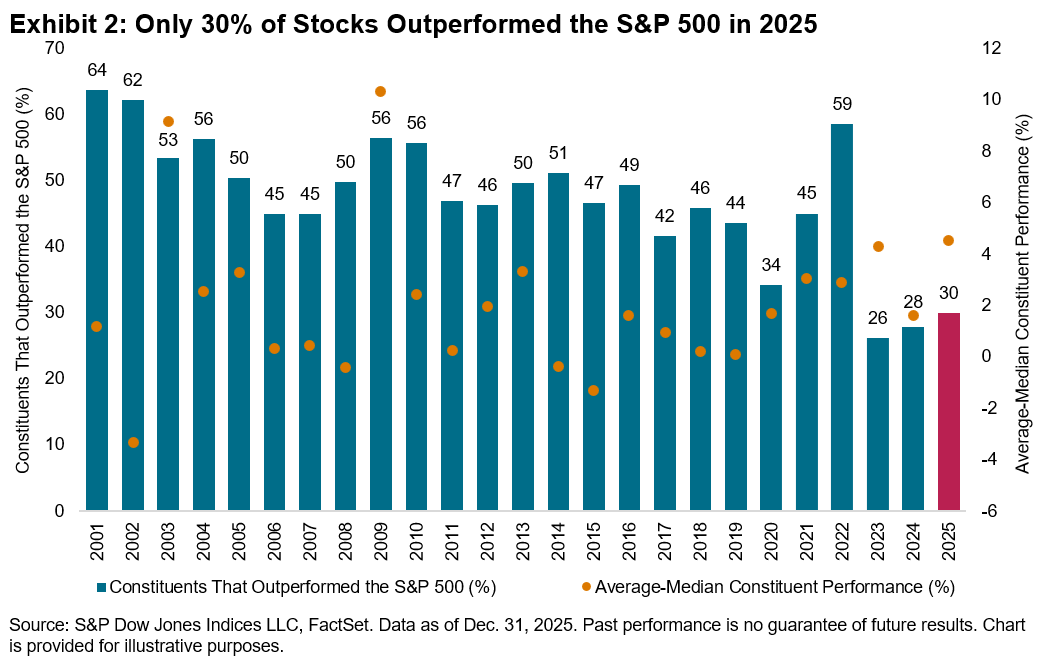 A related headwind for stock pickers was that these mega-cap gains were driven by a handful of stocks, leading to a