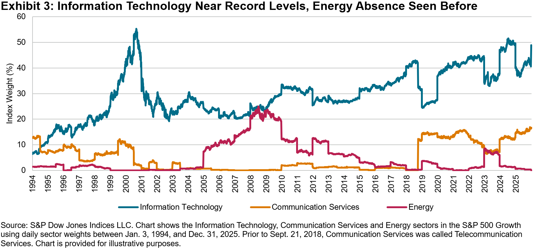Although the post-rebalance Information Technology and Communication Services weights in the S&P 500 Growth rank among the highest since the current S&P U.S. Style Indices’ approach to defining style was introduced in 2009, these levels are not unprecedented. For instance, Information Technology companies accounted for 55.3% of the index in August 2000 (see Exhibit 3). Likewise, Energy’s absence from the S&P 500 Growth after the 2025 reconstitution is not unprecedented—this last occurred in May 2002, following a long-term decline in its weight. Specifically, Energy companies exhibited stronger price-to-book, price-to-earnings and sales-to-price ratios alongside weaker sales and earnings growth. These shifts underscore how the S&P U.S. Style Indices can reflect prevailing market trends, with AI currently serving as a key driver of the U.S. Information Technology and Communication Services sectors, while mostly lower, more volatile commodity prices shaped the reclassification of Energy companies after record profitability in 2021-2022.