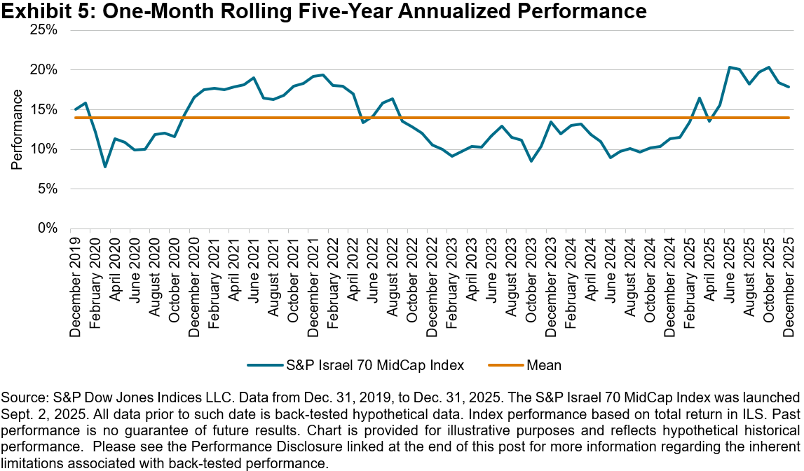 The index can serve as a benchmark for funds and ETFs seeking to provide BDC exposure in the private credit direct lending space. Exhibit 3 presents a five-year performance comparison in total return terms between the S&P BDC Index and other indices, showing that it outperformed them for much of the period.
