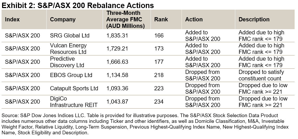 SRG Global, Vulcan Energy and Predictive Discovery will all be added to the S&P/ASX 200 after their three-month average FMC at the rebalance reference date exceeded the 179-rank buffer for selection. Conversely, security price depreciation resulted in Catapult Sports Ltd and DigiCo Infrastructure REIT falling below the 221-rank buffer. Meanwhile, EBOS Group was dropped despite not falling below the buffer, as three higher-ranked companies were added.