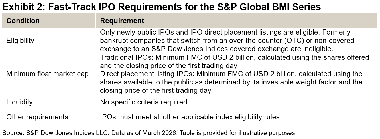 The eligibility criteria for the S&P/ASX Indices include size, determined by three-month average float-adjusted market capitalization (FMC), or total market capitalization (TMC) for the All Ordinaries; liquidity, measured by median daily value traded over three months relative to the broader market; minimum free float factor; and absence of trading suspension.